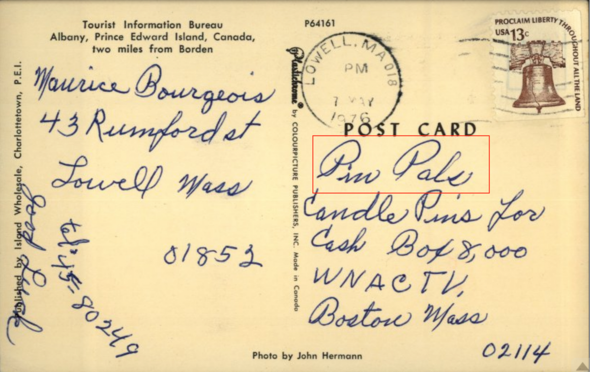 Today's postcard for 12 Days of Postcards is featured on a popular TV show in the 1970s. Candlepins for Cash was a Boston-based TV show that premiered in 1973. Contestants would bowl on the show to win money. A portion of the show was dedicated to randomly pulling out postcards from a batch to win a prize. If the contestant won, so did their “Pin Pal.” A number of postcards were sent from the Island to the show. They would write clever messages to wish their potential partner good luck.