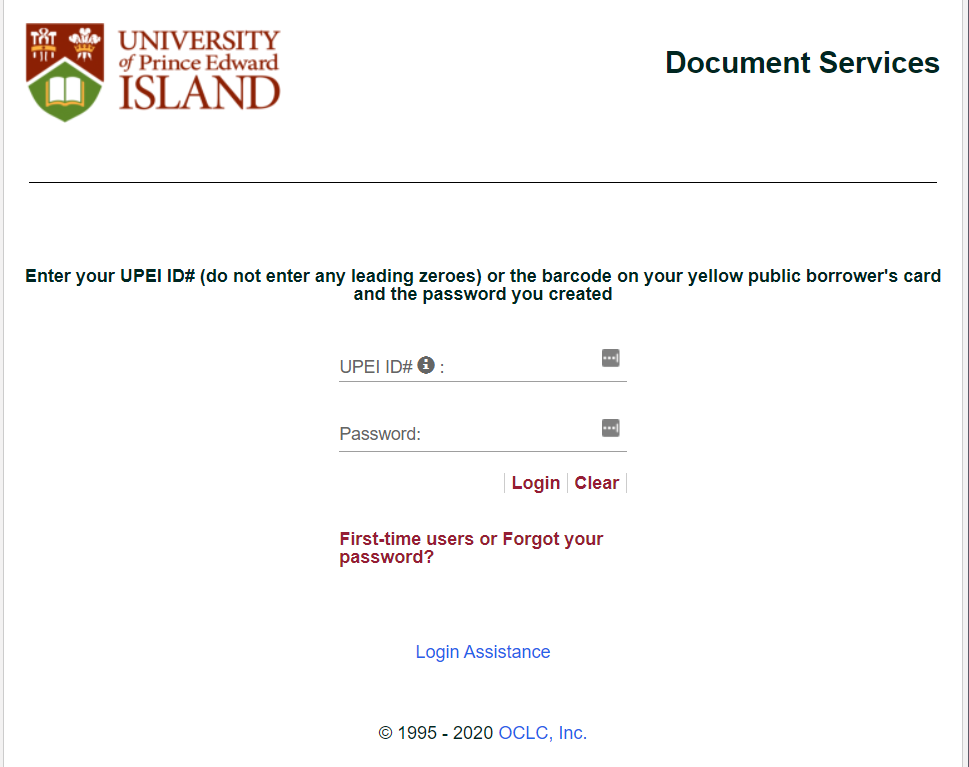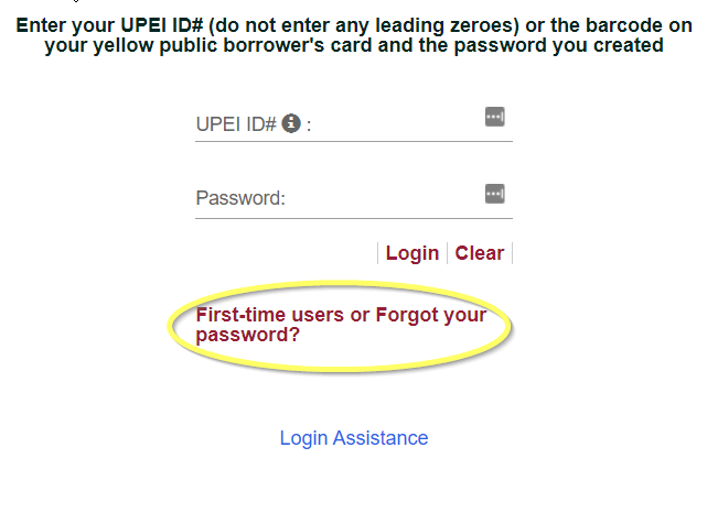 UPEI campus community members use their Campus ID (staff#, student#, UPEI#, etc.) as their login. That number is on their campus card, or in their letter of acceptance (ignore any leading zeroes). Recent ID numbers are a 6 digit number beginning with 3. Public patrons (ie, graduated students, former employees, etc.) will still use that number. Public patrons who have never had a UPEI ID# will use the barcode on their yellow public borrower's card (37348...).