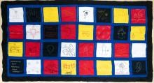 The most notable element of the display, however, is the underlying quilt, with squares stitched by 16 Shubenacadie survivors from Epekwitk, sharing memories of their residential school experience.