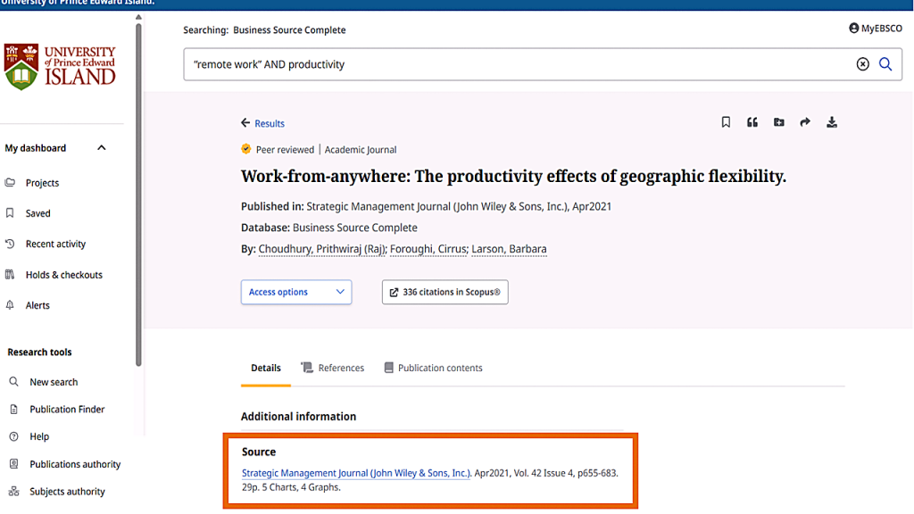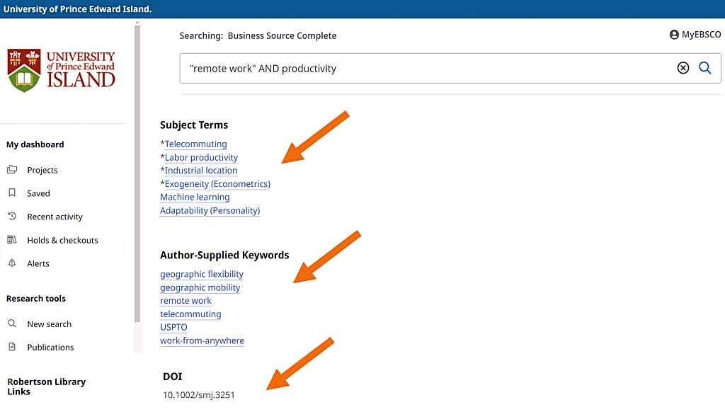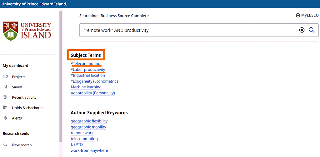 In Business Source Complete, a standard set of subject terms are used to help organize the articles. Here, I see the term “telecommuting” used for remote work, and “labor productivity” used as a more specific term for productivity.