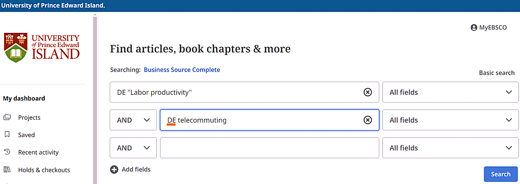I will put the first keyword, remote work, into the top search box. Because there are two words in the phrase “remote work,” I’m going to put quotation marks around it. Then, I will put the second keyword, productivity, in the next search box. Note the use of AND between these boxes, to specify that we want results that use both concepts.