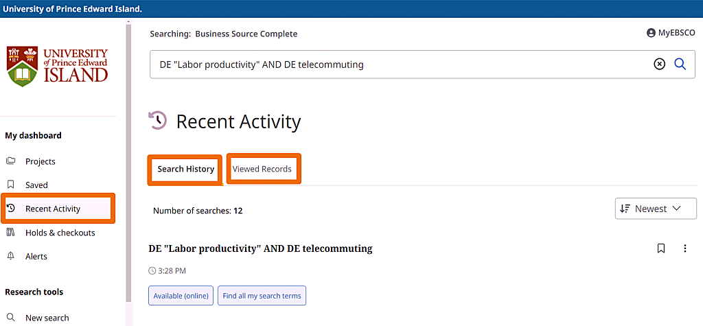 If I want to see an article that I clicked on earlier, I can use the “Recent Activity” section in the menu on the left side of the page. On this page, there are two sections: Search History and Viewed Records.