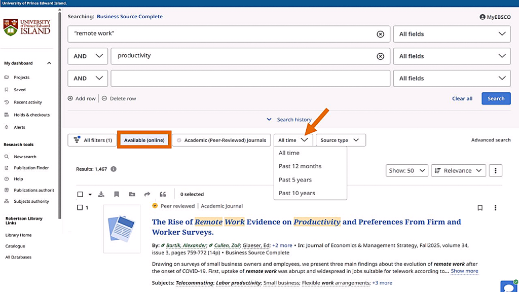 For example, I can choose only the results that are Available (online) in full text. Under the “All time” button, I can choose to only see results from the past 12 months, 5 years, or 10 years,