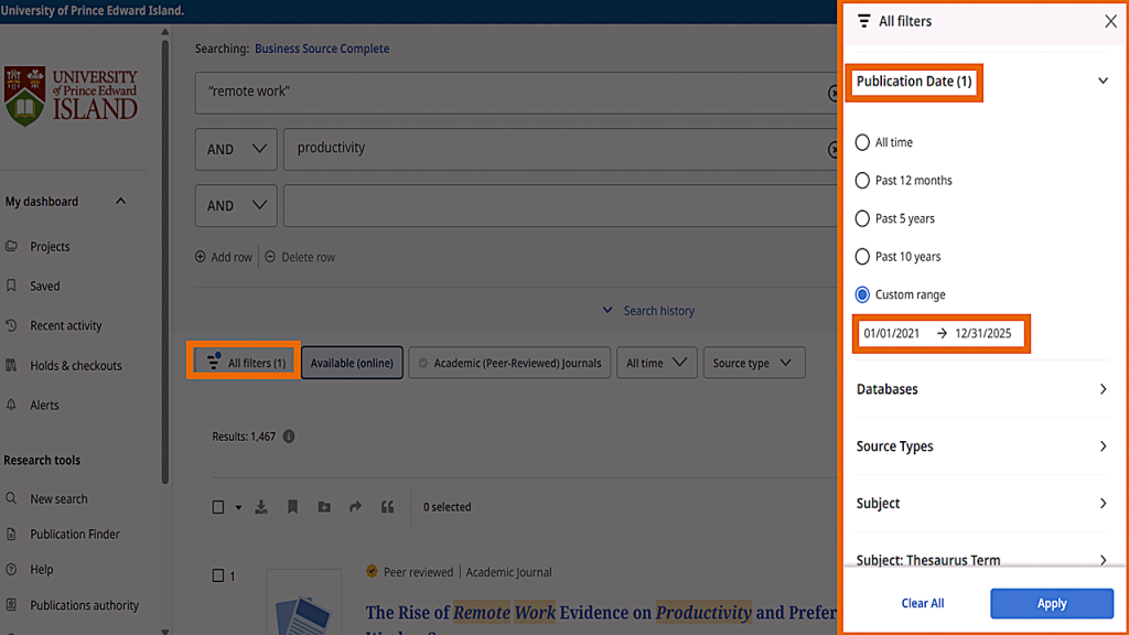 but I can also use the “All filters” button to open the filters window and set a more specific time period in the “Publication Date” section. I’ll set a custom date range for anything from January 1, 2021, through December 31, 2025.