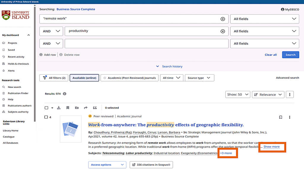 If I want to know more about a specific search result, the “show more” and “plus more” links show me more of the abstract and all of the subject terms.