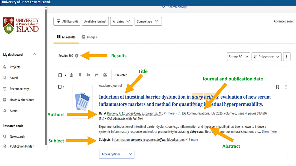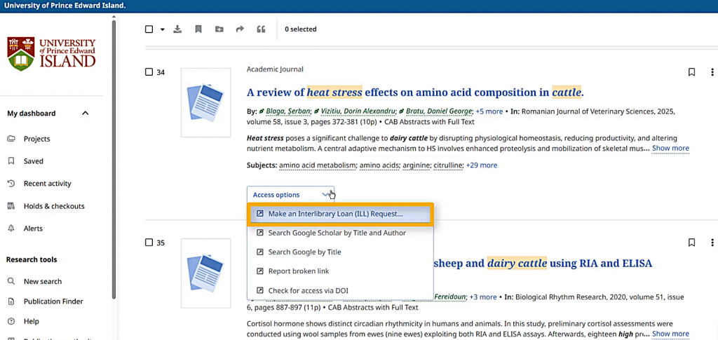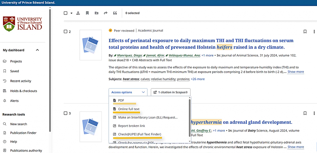Each item has a dropdown menu labeled “Access options.” I can access the full text by choosing a link that mentions "full text," a file format such as PDF, or "Check@UPEI (Full Text Finder)".  Different items might have different sets of links. The PDF and “Online full text” links will open in the current tab, while other links will open in a new tab or window.