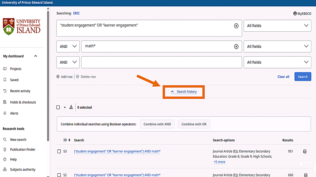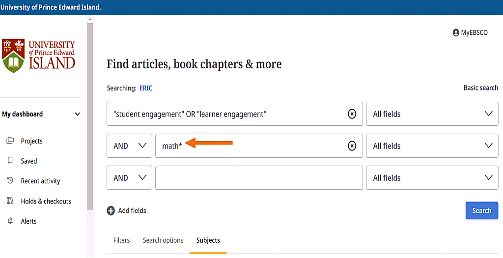 So I’ll add “learner engagement” as a search term. Searching for “student engagement” OR “learner engagement” will help me find any articles that use “student engagement” in places like the title or abstract, while also including articles that have “learner engagement” in their standardized subject terms.