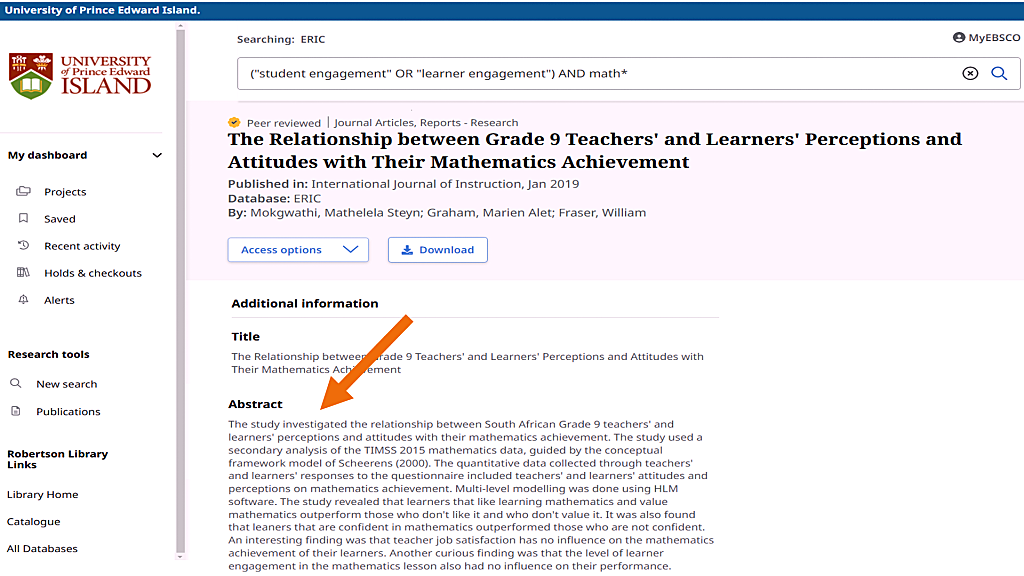In the Access Options dropdown, the Full Text from ERIC link should take me to the full text of this article. So will a Check@UPEI (Full Text Finder) link, a PDF link, or a link that says something like “Online full text” or “Linked full text.”