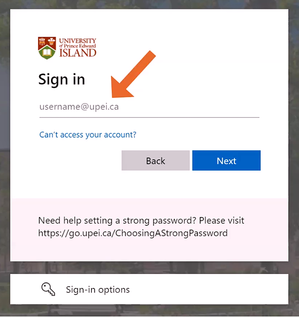 If you’re off campus, you will be asked to log in. Use your UPEI username and password to log in. This is the same username and password that you would use to access Moodle or your UPEI email.