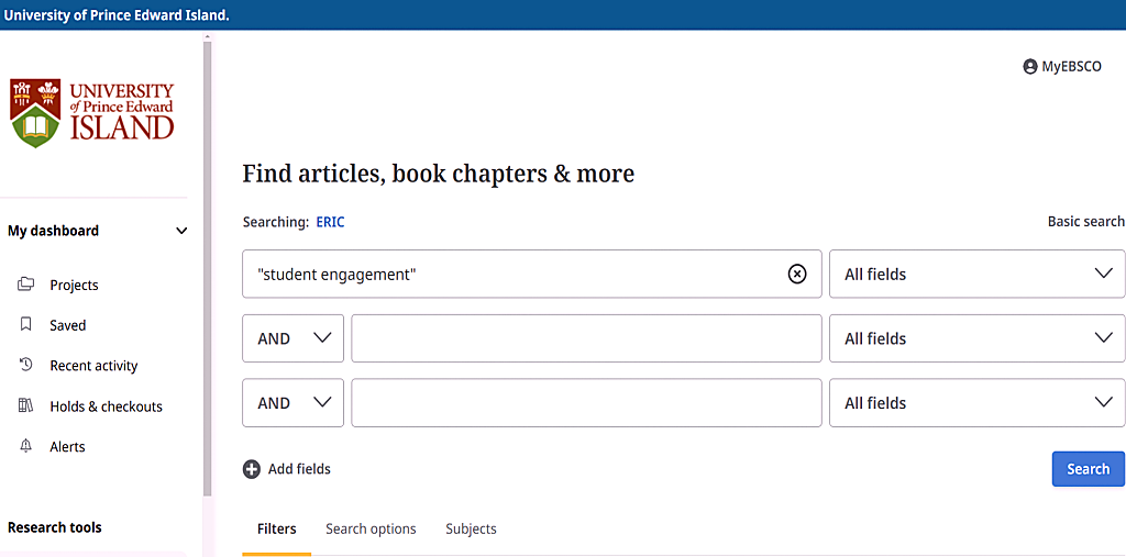 As an example, I’ll search for information about strategies to increase student engagement in math classes. ERIC uses a keyword-based search, so I only want to search for the most important words in my topic. In this case, there are two main parts to my topic: student engagement and math classes.