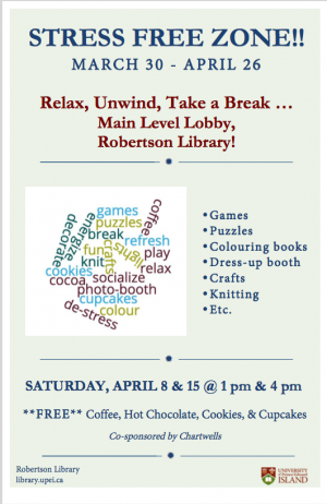 The Robertson Library has set up a Stress Free Zone in the Main Level Lobby of the Library for you!