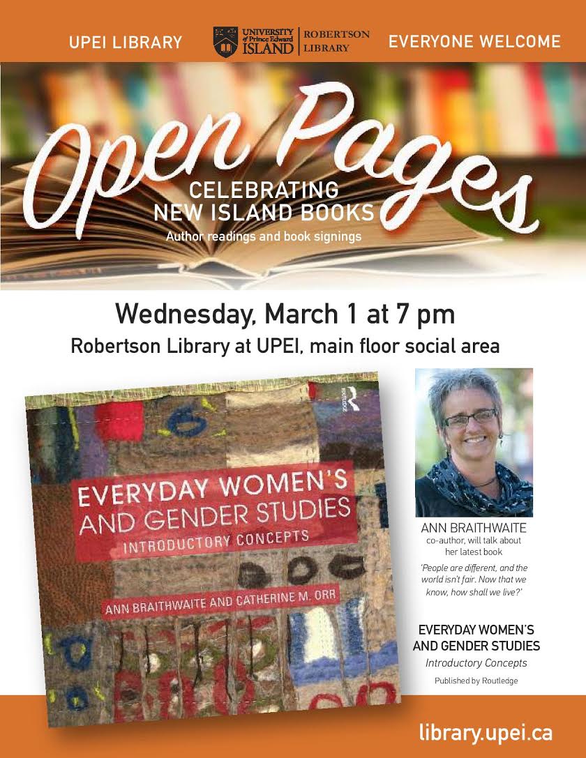 The next “OpenPages” at UPEI’s Robertson Library happens March 1, at 7 pm and highlights the new book by UPEI professor Ann Braithwaite, Everyday Women’s and Gender Studies.