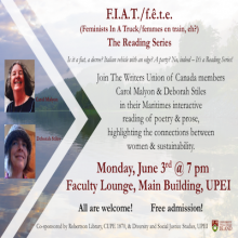 Join The Writers Union of Canada members Carol Malyon & Deborah Stiles in their Maritimes interactive reading of poetry & prose, highlighting the connections between women & sustainability.
