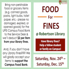 Bring non-perishable food or grocery items (e.g. canned goods, pasta, light bulbs, toilet paper, etc.- please no damaged, expired, or opened goods) for the Campus Food Bank to the Service Desk in the Library from Saturday, November 24th  to Saturday, December 15th, 2018 and we’ll deduct $2.00 per item from your library fines.