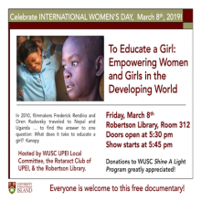 In celebration of International Women’s Day, WUSC UPEI Local Committee, the Rotaract Club of UPEI, and Robertson Library will be showing the documentary To Educate A Girl: Empowering Women and Girls in the Developing World,  by filmmakers Frederick Rendina and Oren Rudavsky.