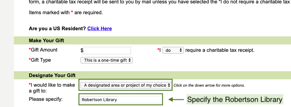 Support the Library - financial donations go through the University's central office: simply contact Development and Alumni Engagement (902-566-0415) and ask to donate to the Library. If you choose to donate using the online form, you can designate your gift and we've included an image below to highlight the two fields you need to update to ensure your gift goes to the Robertson Library. We appreciate your support.