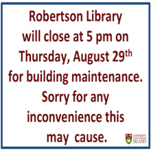 The Library will close at 5 pm on Thursday, Aug, 29th for building maintenance. Sorry for any inconvenience this may cause.