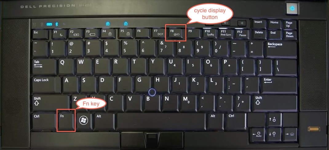 • Next look for a key on the laptop keyboard that cycles the display, normally this is one of the Function keys along top.  In our example pictured below it is the F8 key.