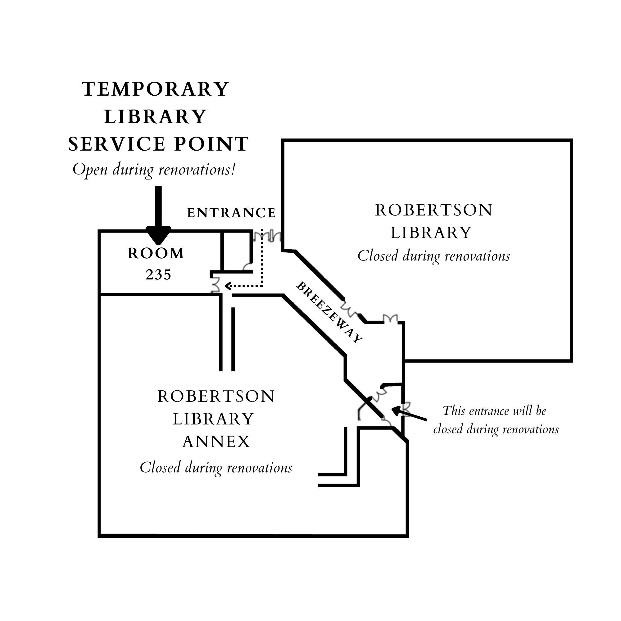 Beginning May 4, 2026, limited in-person library services will be available in Robertson Library Annex Room 235 (click here for a map). This temporary service point will be open Monday through Friday, 9:00 a.m. - 5:00 p.m.